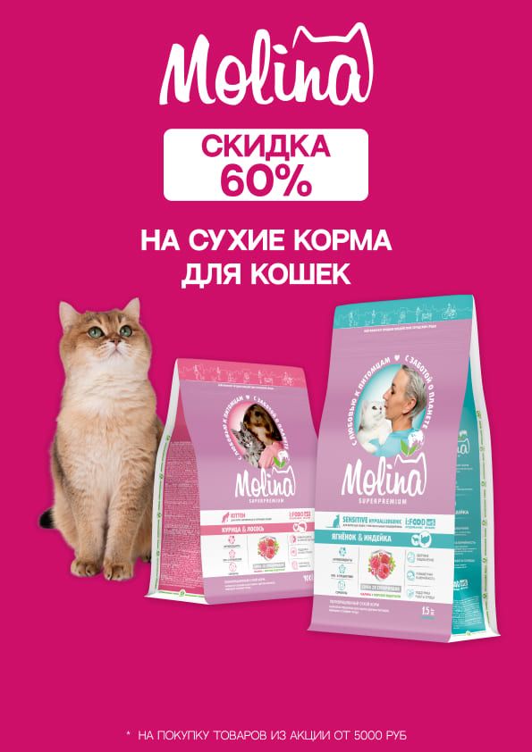 Новая линейка сухих кормов Molina для кошек и собак создана с учетом рекомендаций по питанию животных, ведущих малоподвижный образ жизни.