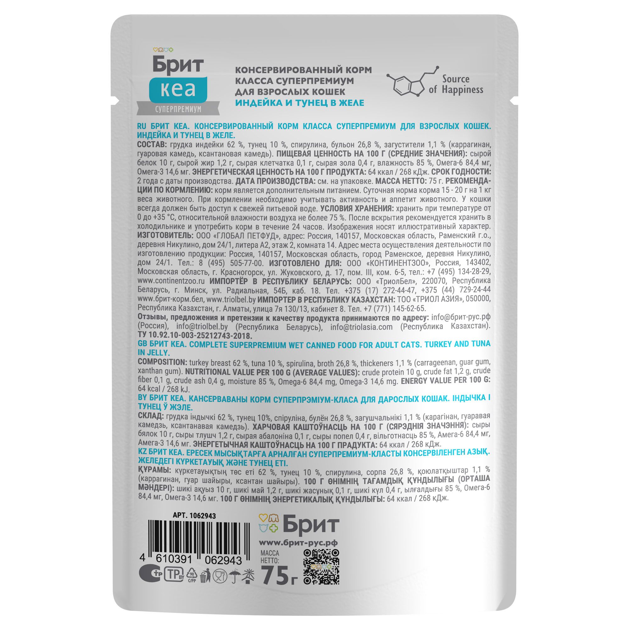 - БРИТ КЕА, Пауч для взрослых кошек, Индейка и Тунец в желе, 75 г, 1062943