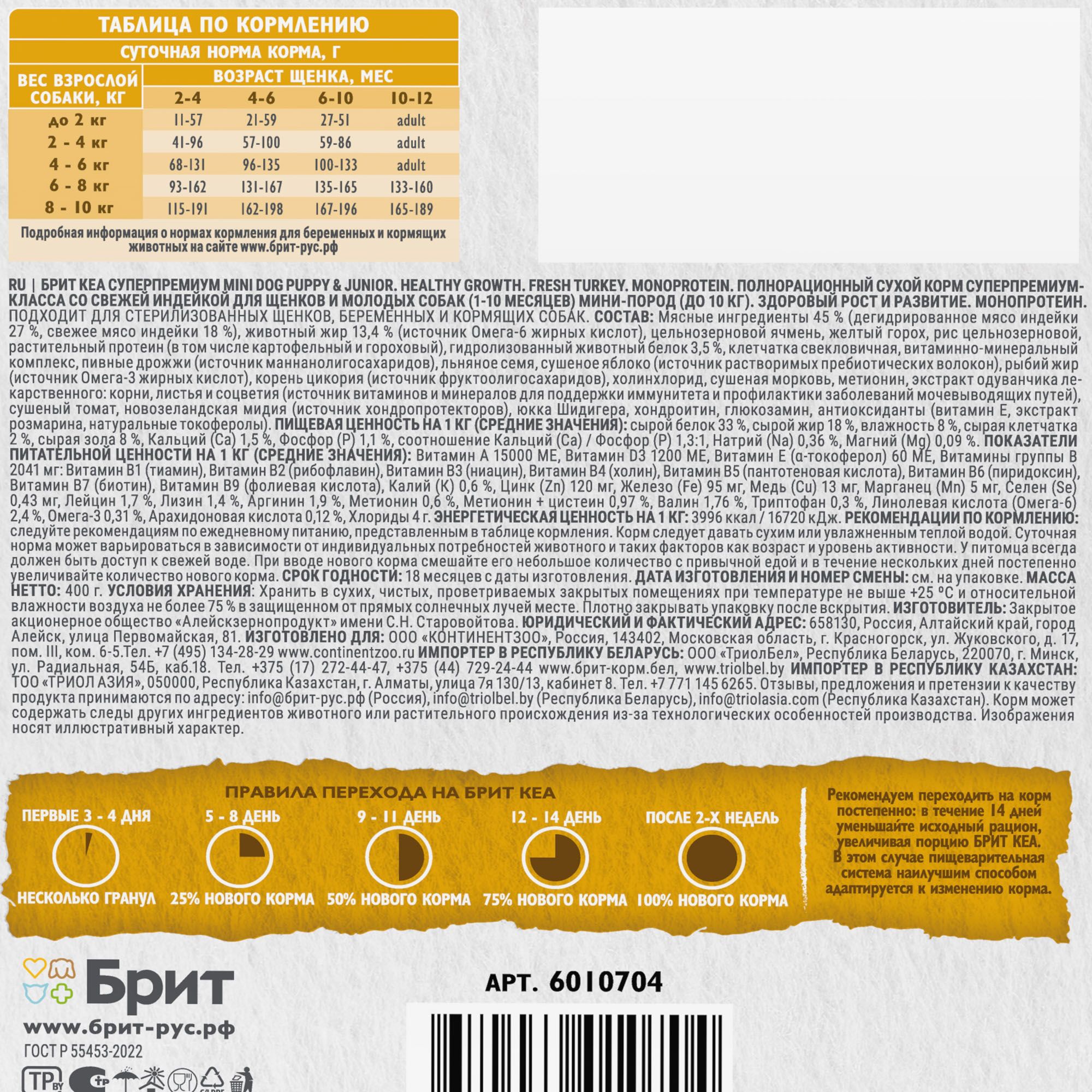 - Брит Кеа Сух корм MINI DOG PUPPY & JUNIOR.HEALTHY GROWTH.MONOPROTEIN с индейкой д/щен,0,4кг, 6010704