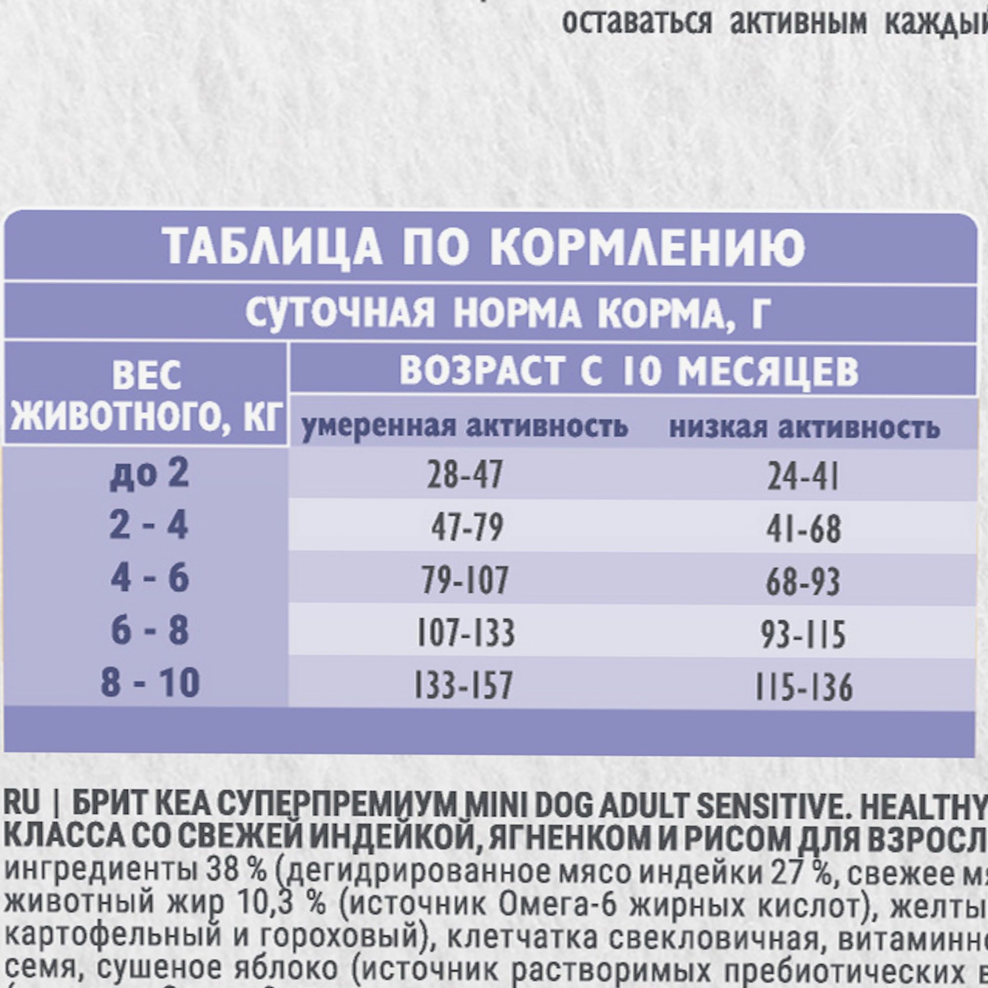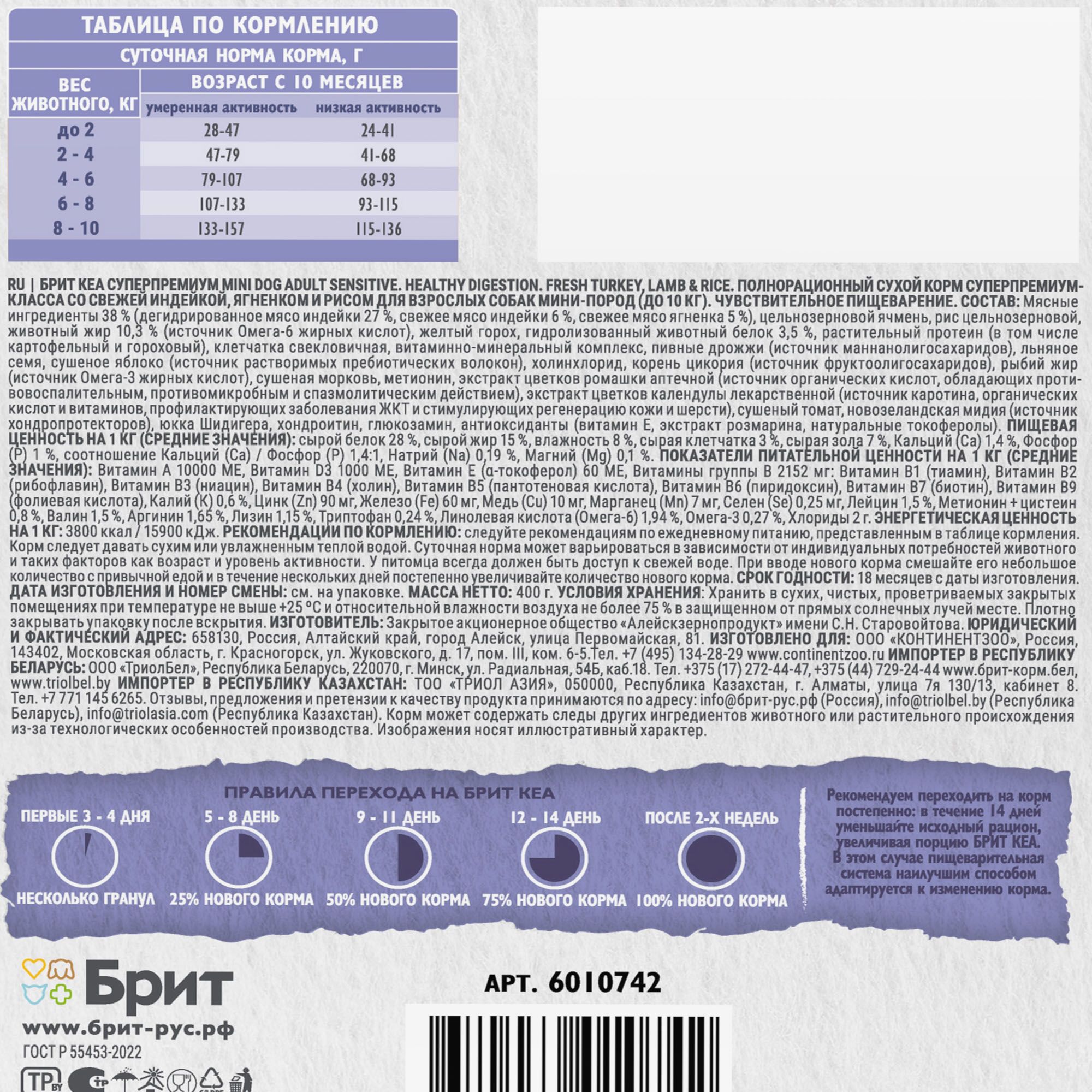 - Брит Кеа Сухой корм MINI DOG ADULT SENSITIVE.HEALTHY DIGESTION с инд, ягнен. и рис, 0,4 кг, 6010742