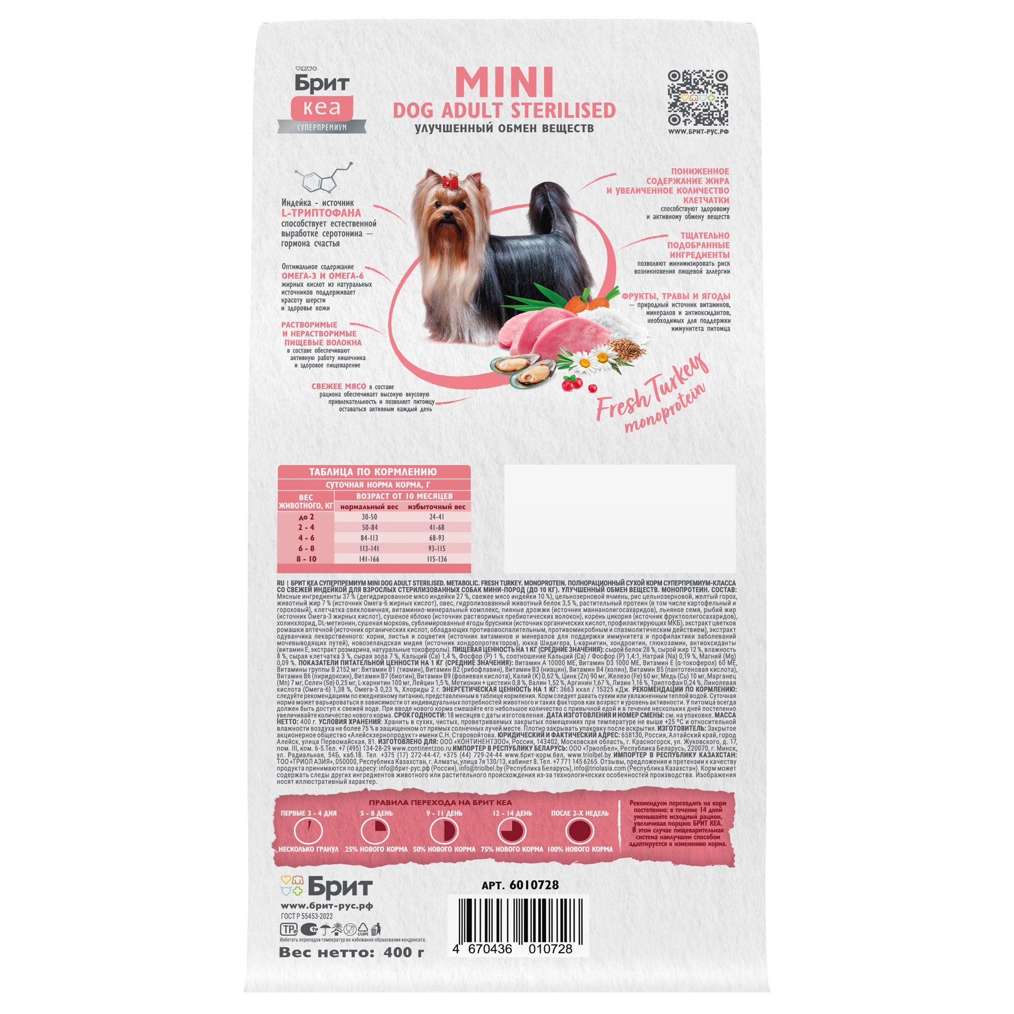 Брит Кеа Сухой корм MINI DOG ADULT STERILISED.METABOLIC.MONOPROTEIN с индейкой д/взр, 0,4кг, 6010728