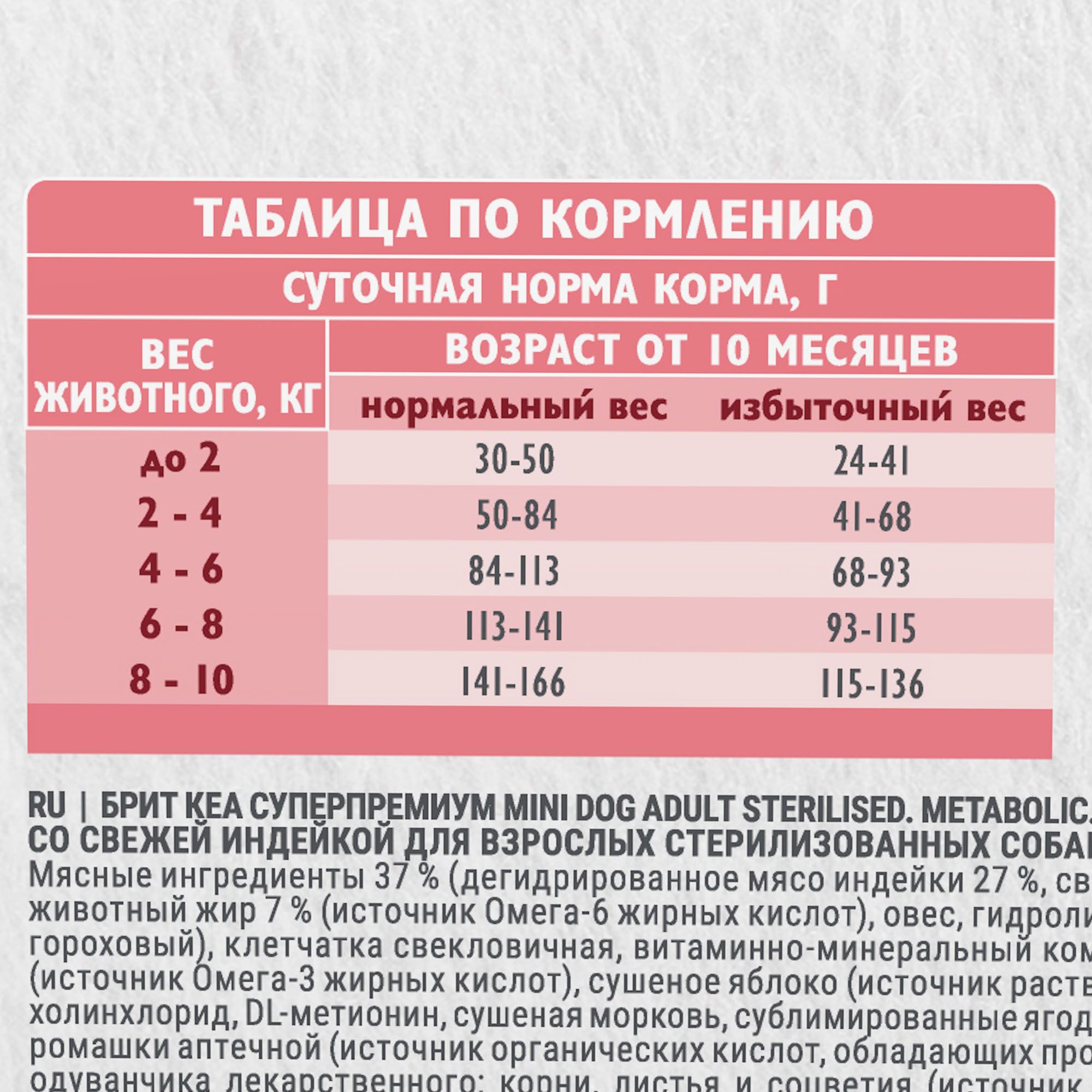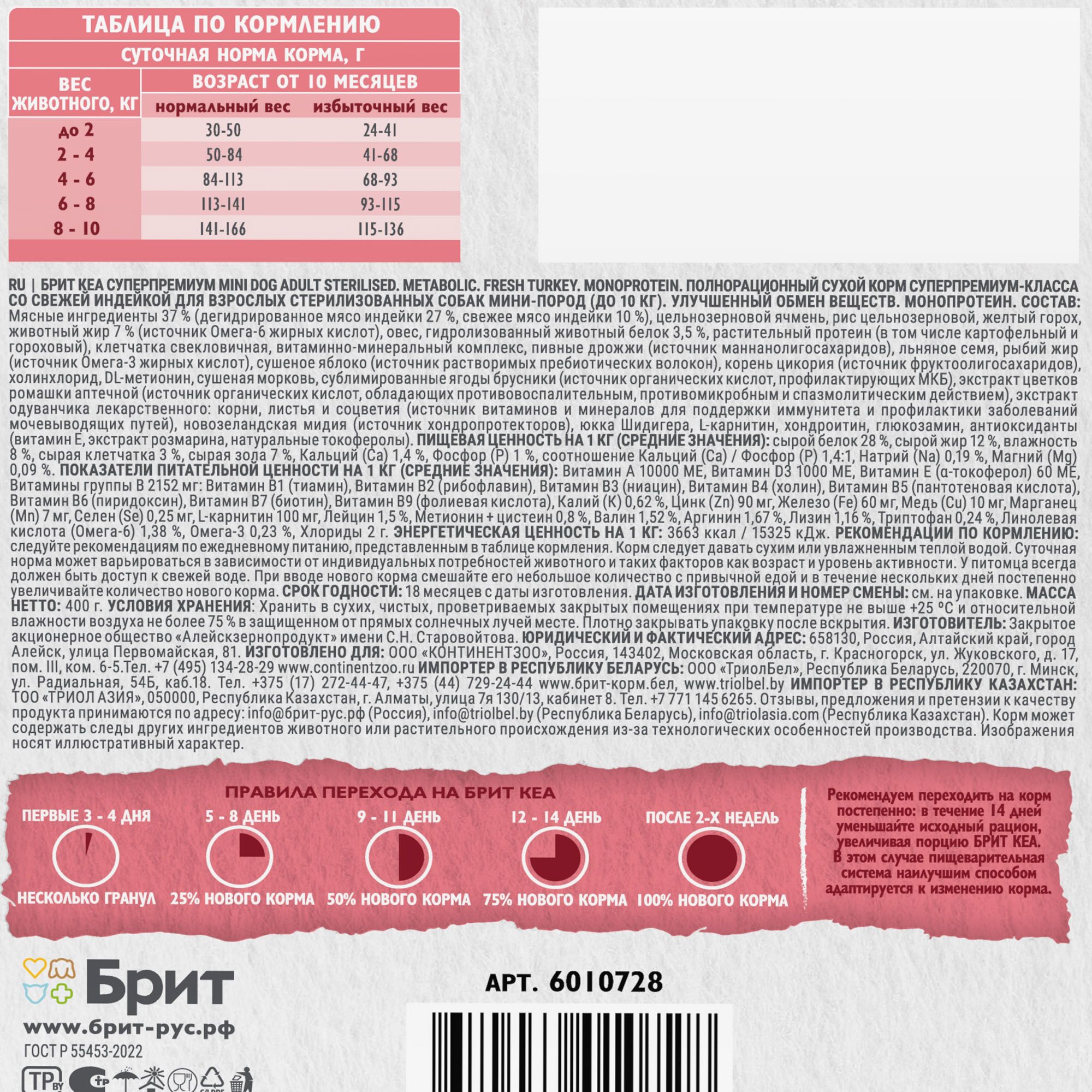 - Брит Кеа Сухой корм MINI DOG ADULT STERILISED.METABOLIC.MONOPROTEIN с индейкой д/взр, 0,4кг, 6010728