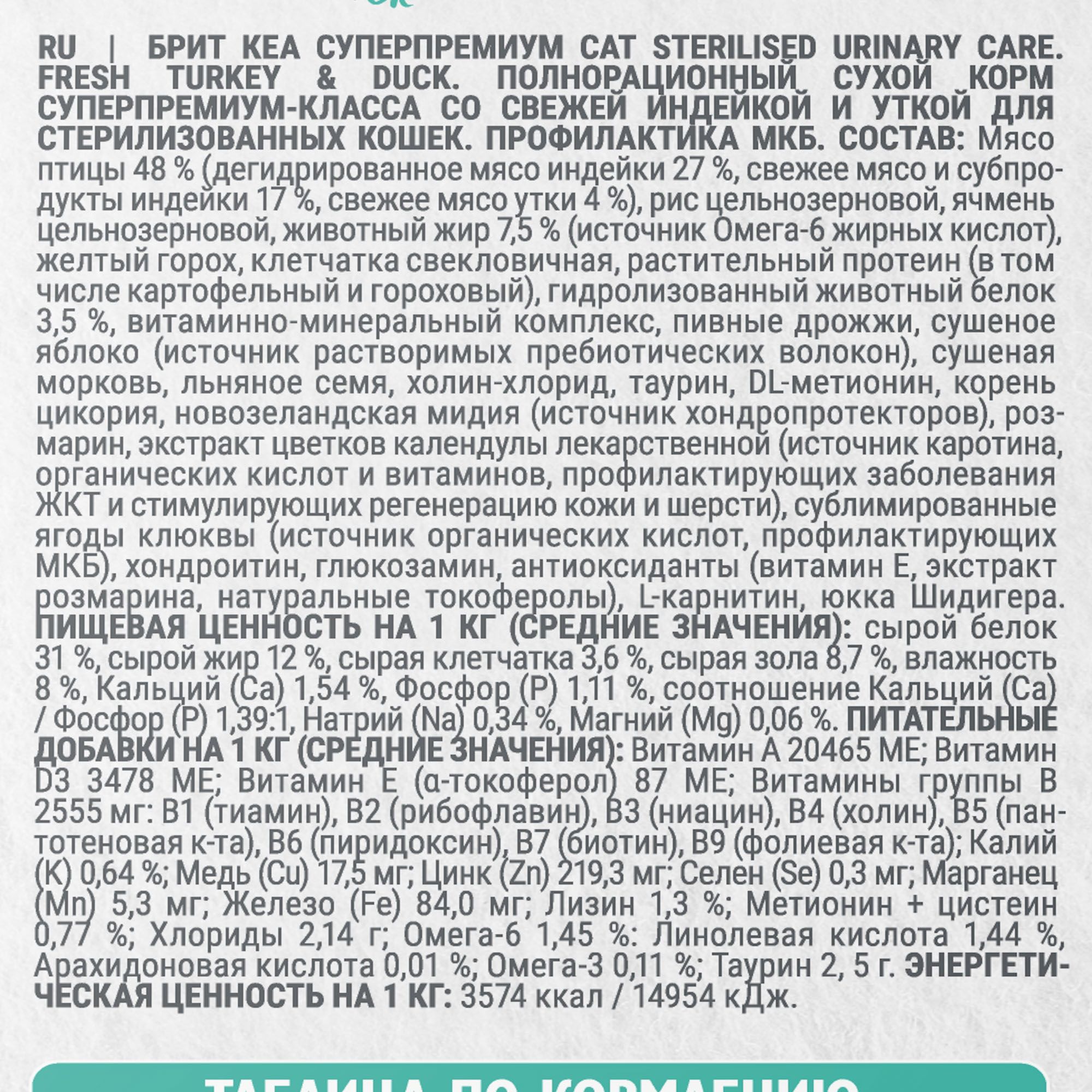 - БРИТ КЕА, Сухой корм с индейкой и уткой для стерил. кошек. STERILISED URINARY CARE, 7 кг, 1067078