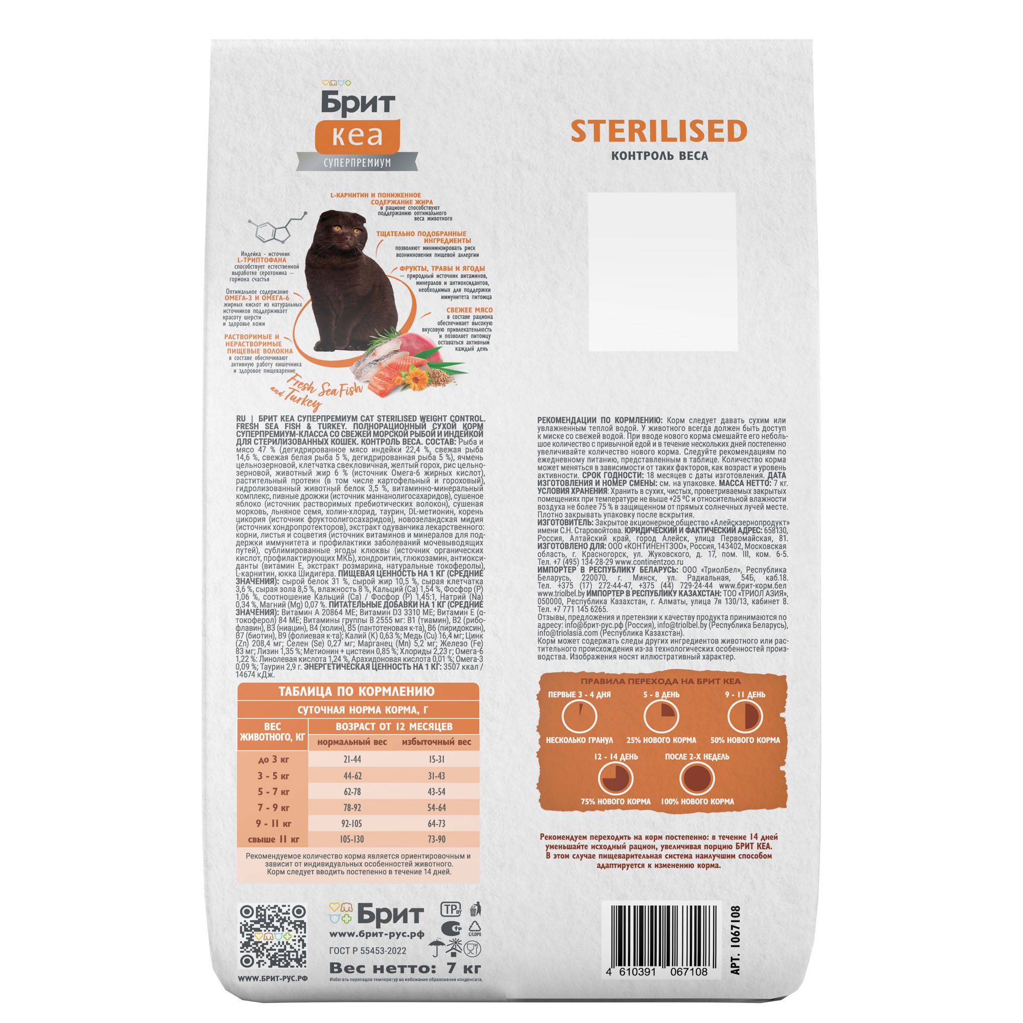 - БРИТ КЕА, Сухой корм с морской рыбой и индейкой для стерил. кошек. WEIGHT CONTROL, 7 кг, 1067108