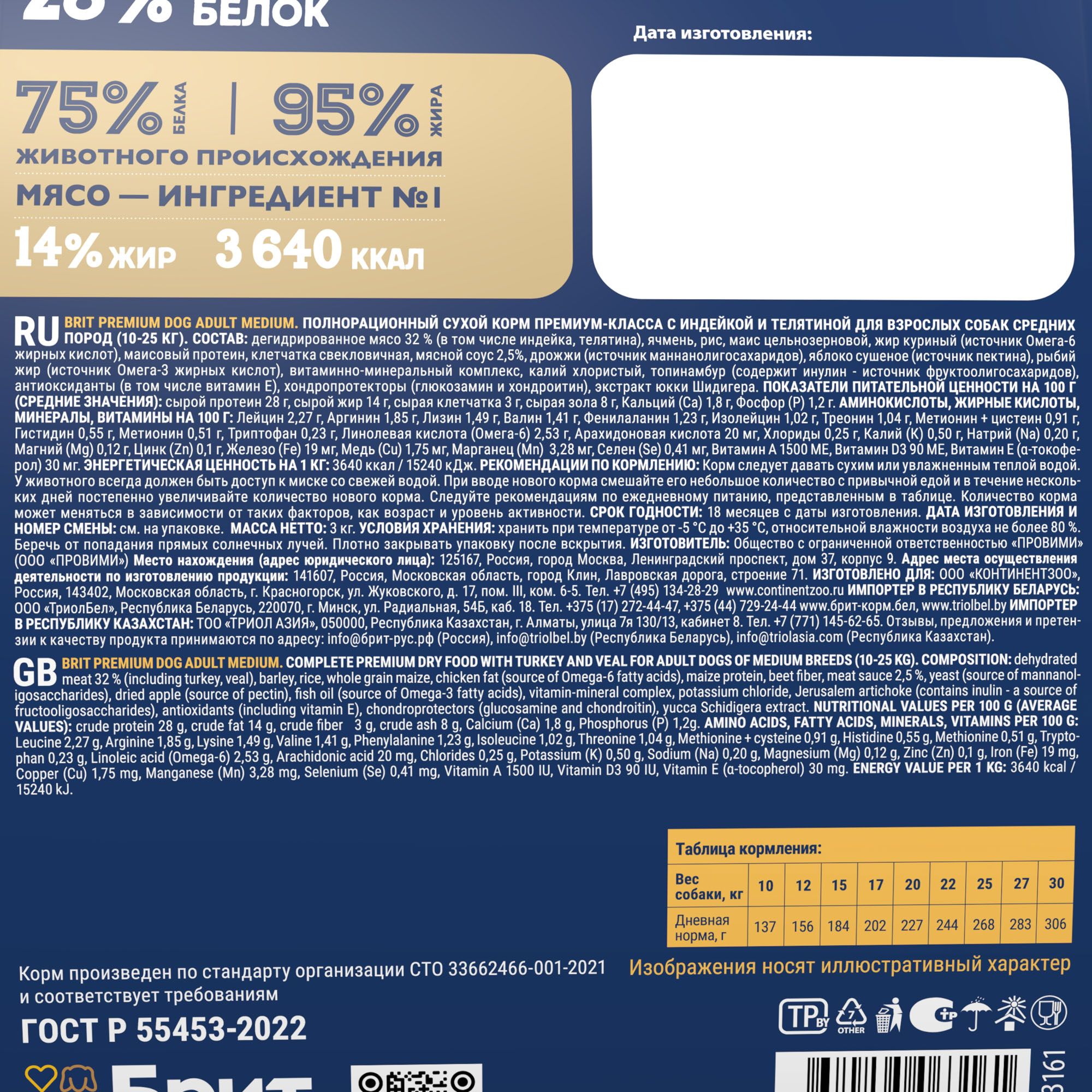 Консервированный корм Брит ПРЕМИУМ идеально подходит для собак весом от 20 кг, обеспечивая оптимальную порцию для поддержания их здоровья и энергии. Срок годности продукта составляет 3 года с даты производства, указанной на упаковке.
