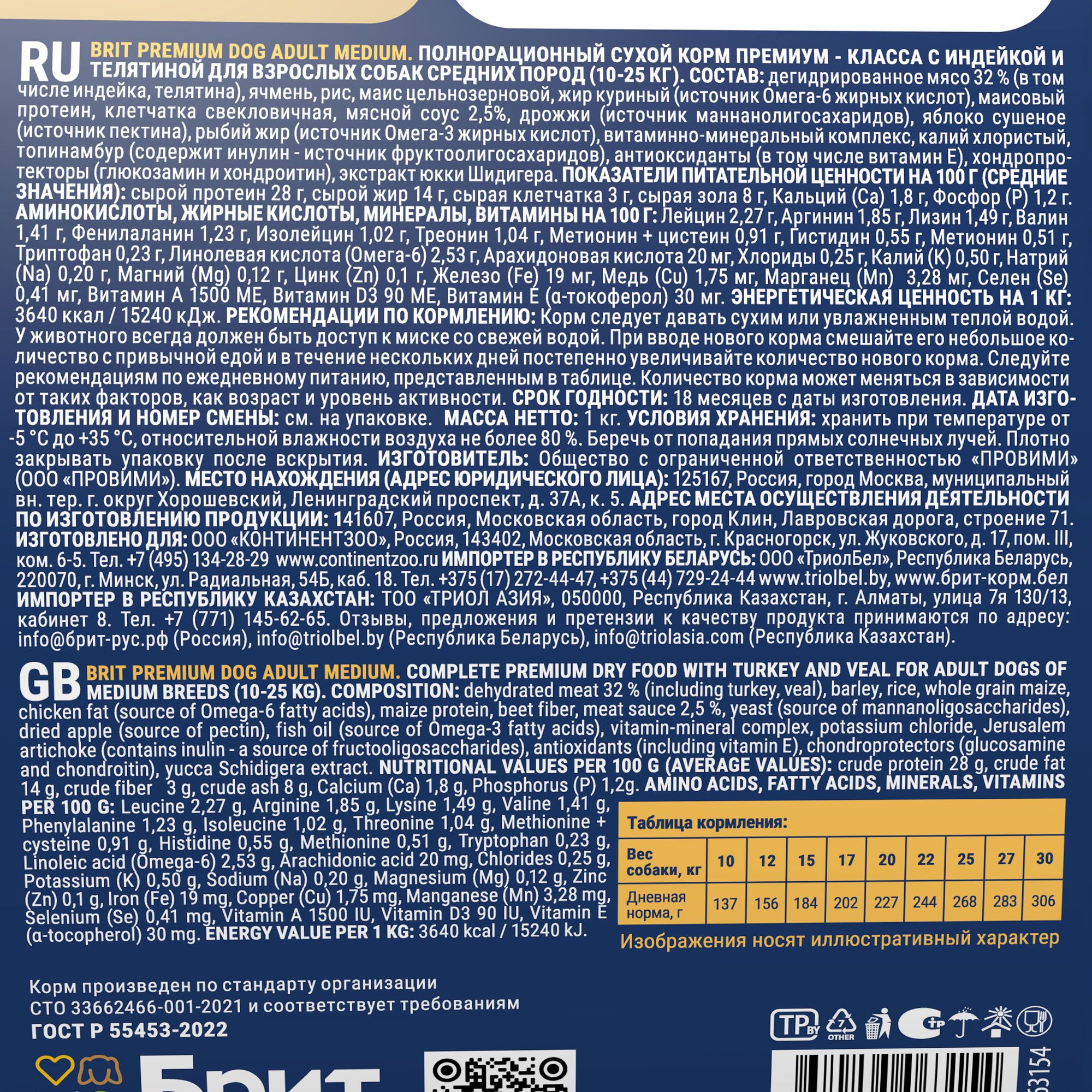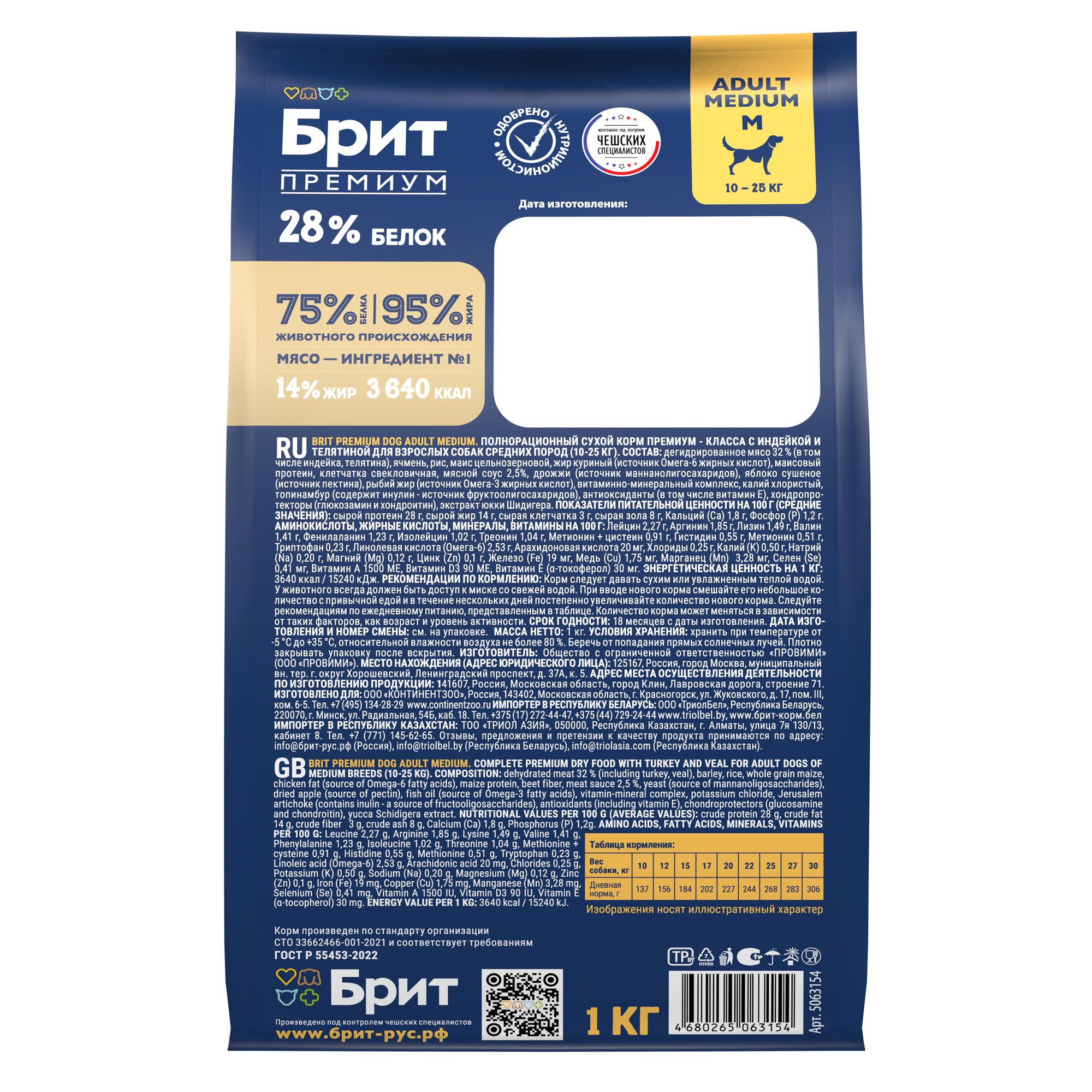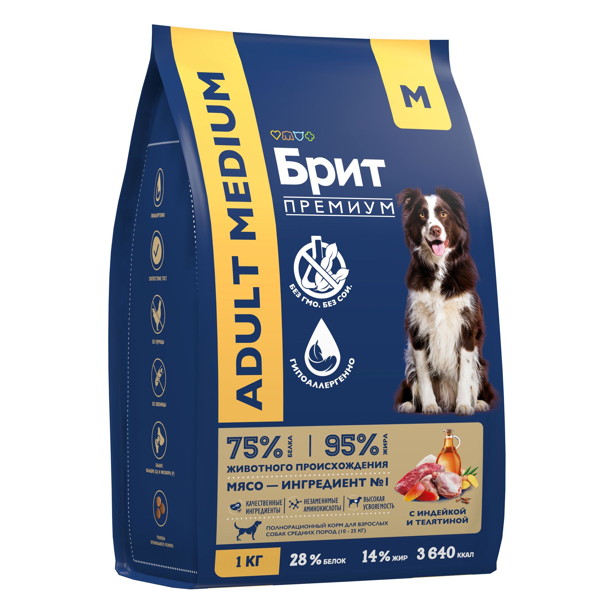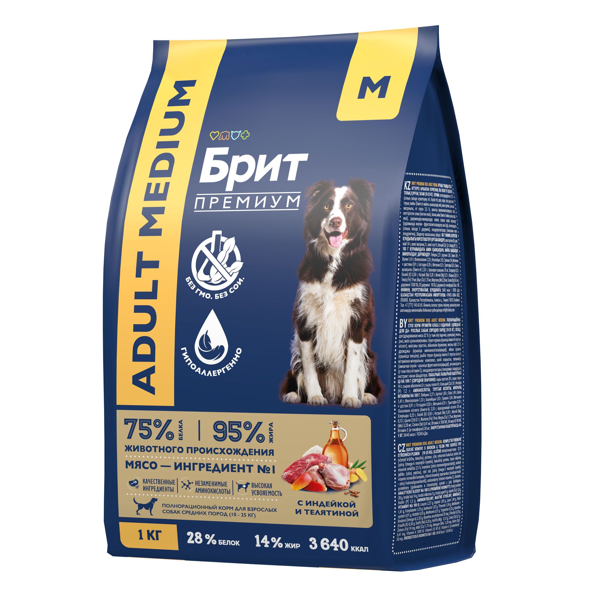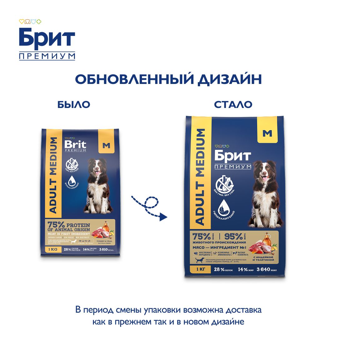 - BRIT PREMIUM, Сухой корм с индейкой и телятиной для собак "Dog Adult Medium",1 кг, 5063154
