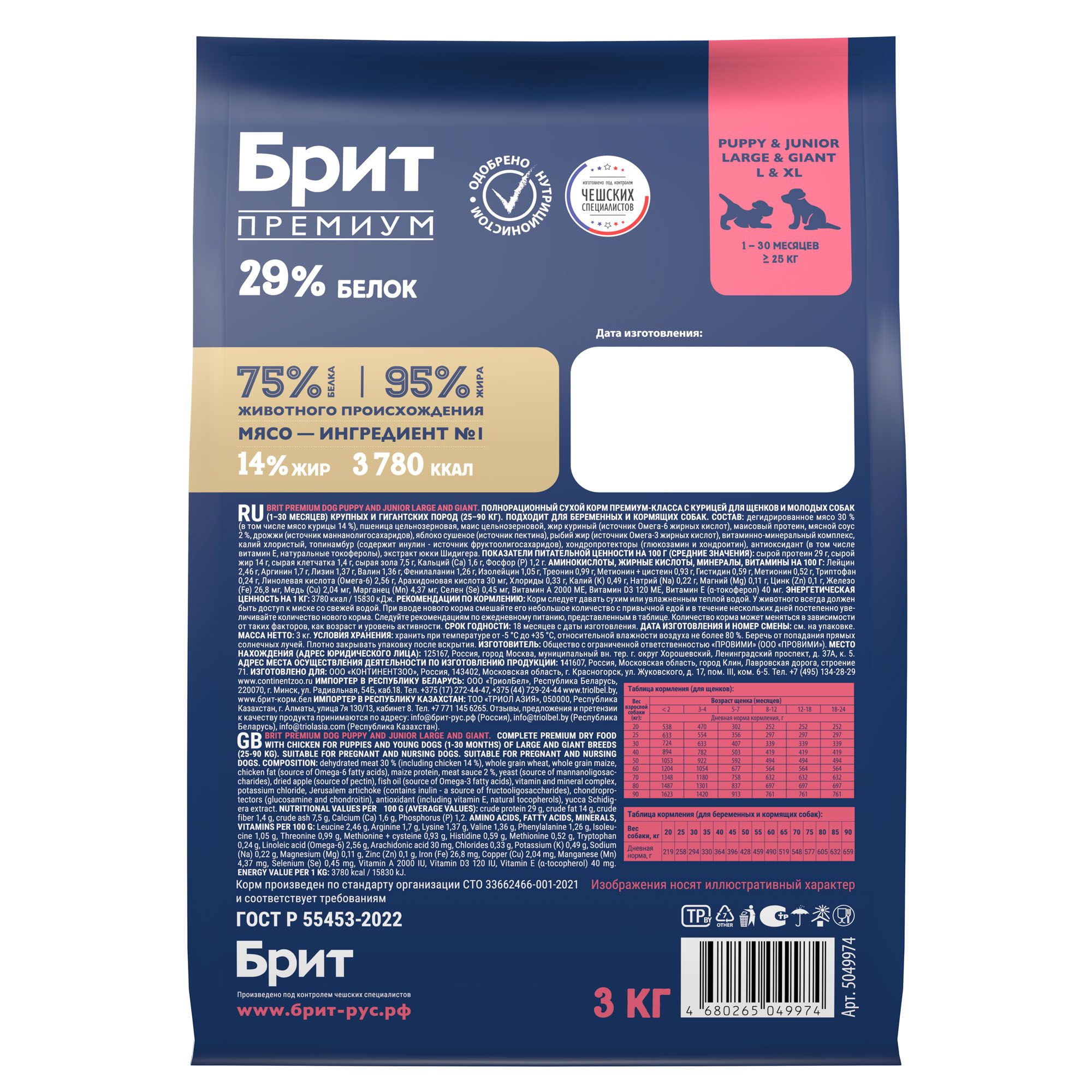 Консервированный корм Брит ПРЕМИУМ идеально подходит для собак весом от 20 кг, обеспечивая оптимальную порцию для поддержания их здоровья и энергии. Срок годности продукта составляет 3 года с даты производства, указанной на упаковке.