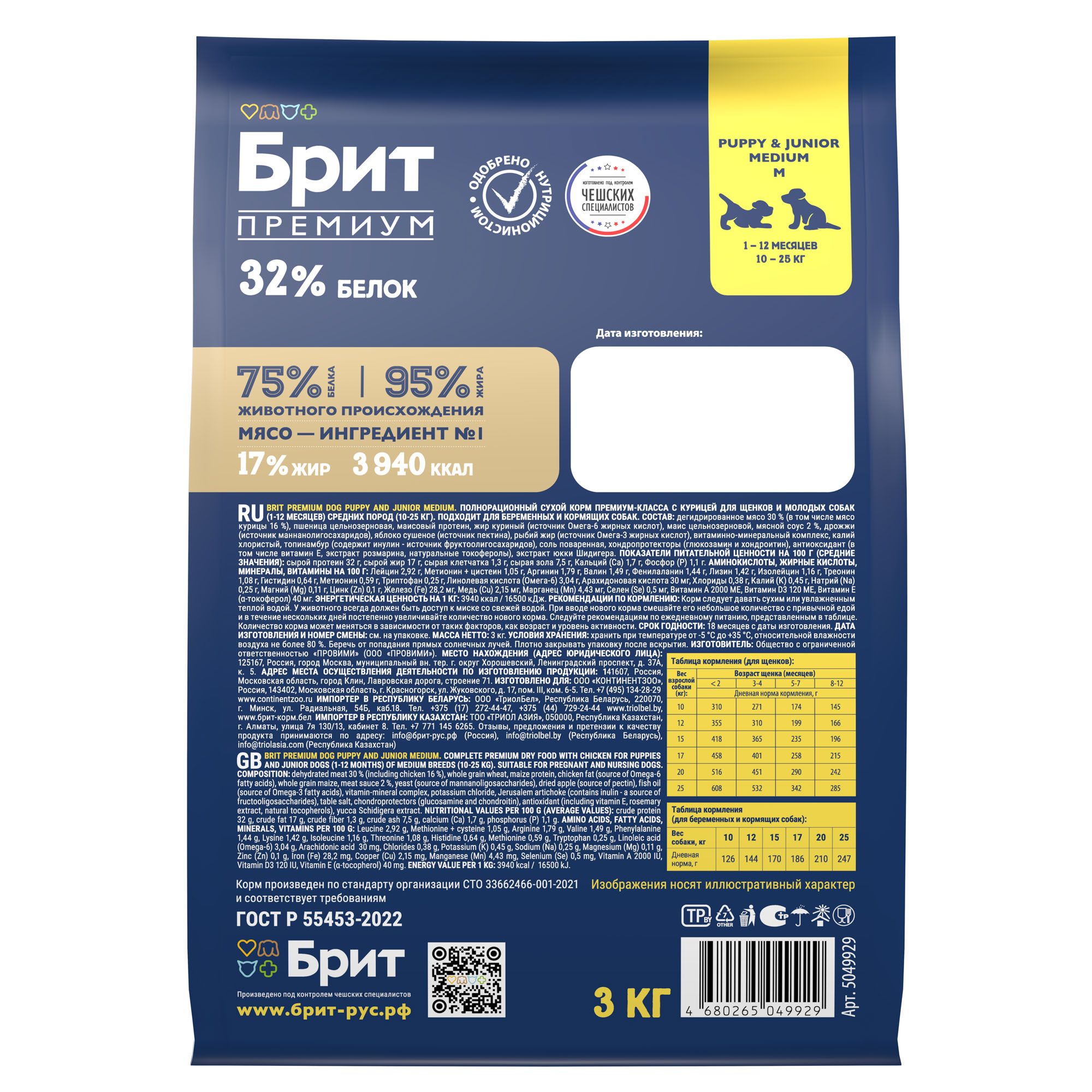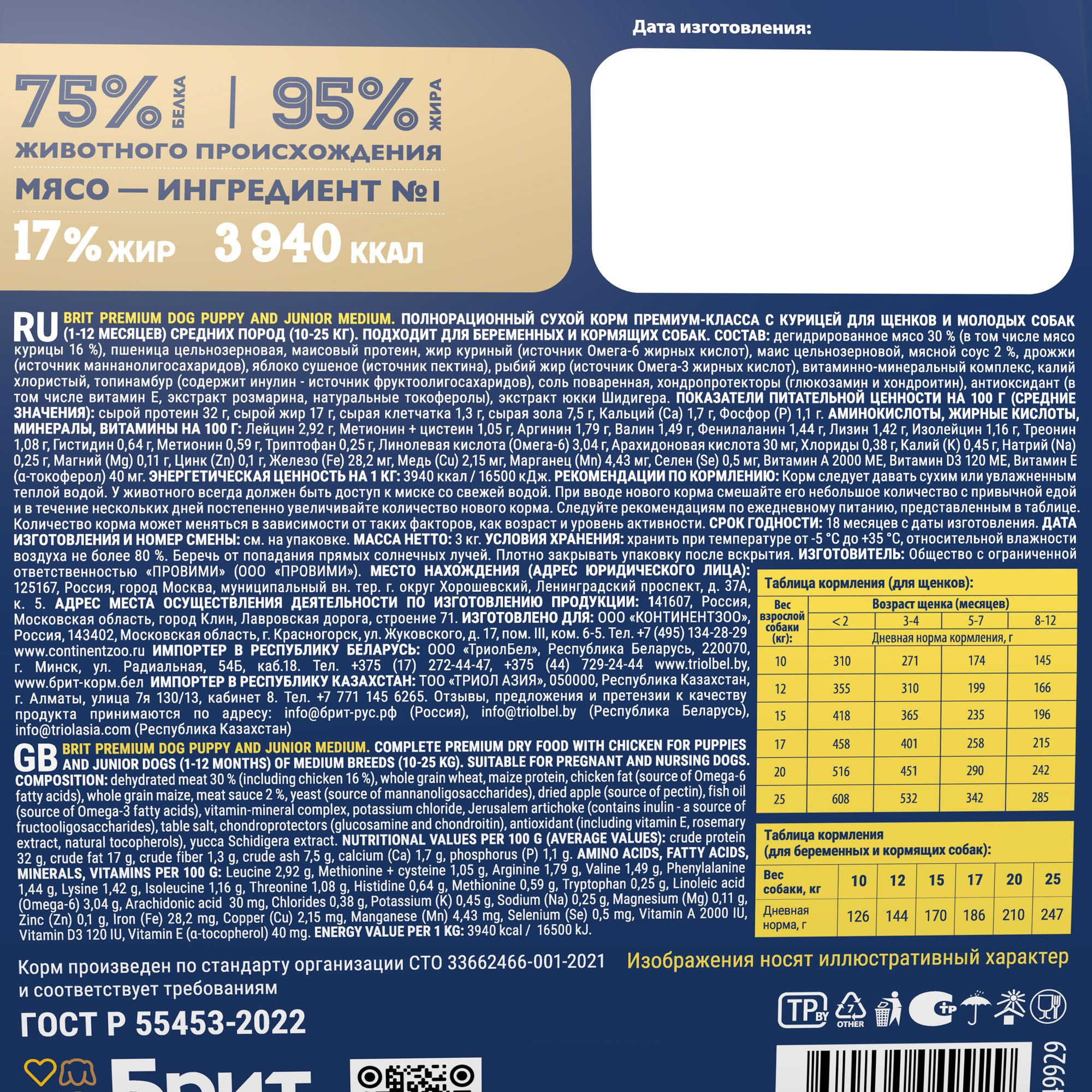 Консервированный корм Брит ПРЕМИУМ идеально подходит для собак весом от 20 кг, обеспечивая оптимальную порцию для поддержания их здоровья и энергии. Срок годности продукта составляет 3 года с даты производства, указанной на упаковке.