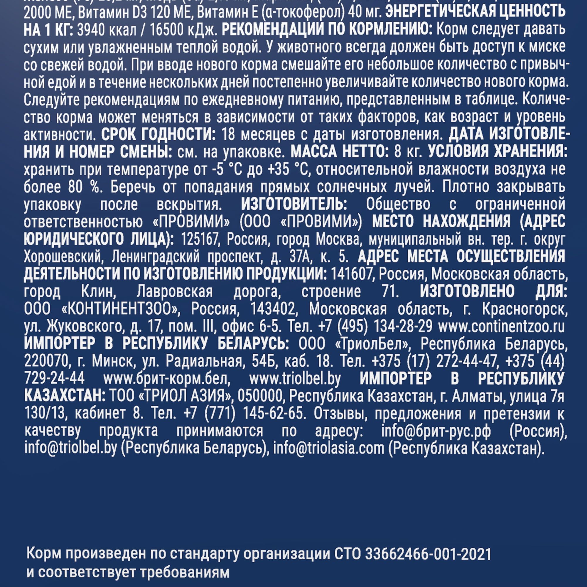 Консервированный корм BRIT PREMIUM BY NATURE подходит для взрослых собак всех пород и оптимально рассчитан для питомцев весом от 10 кг. Срок годности продукта составляет 3 года с даты производства, указанной на упаковке.