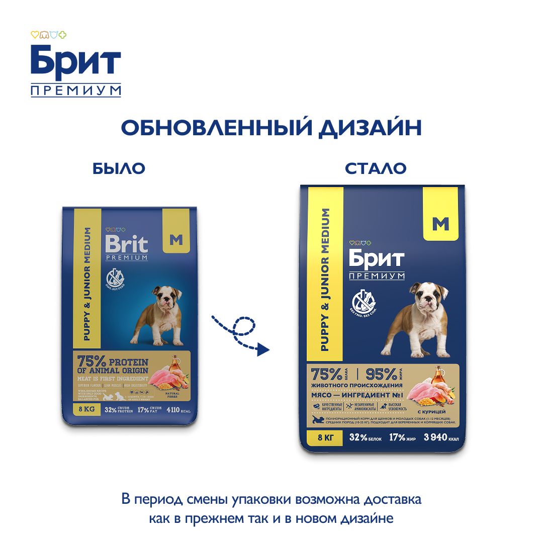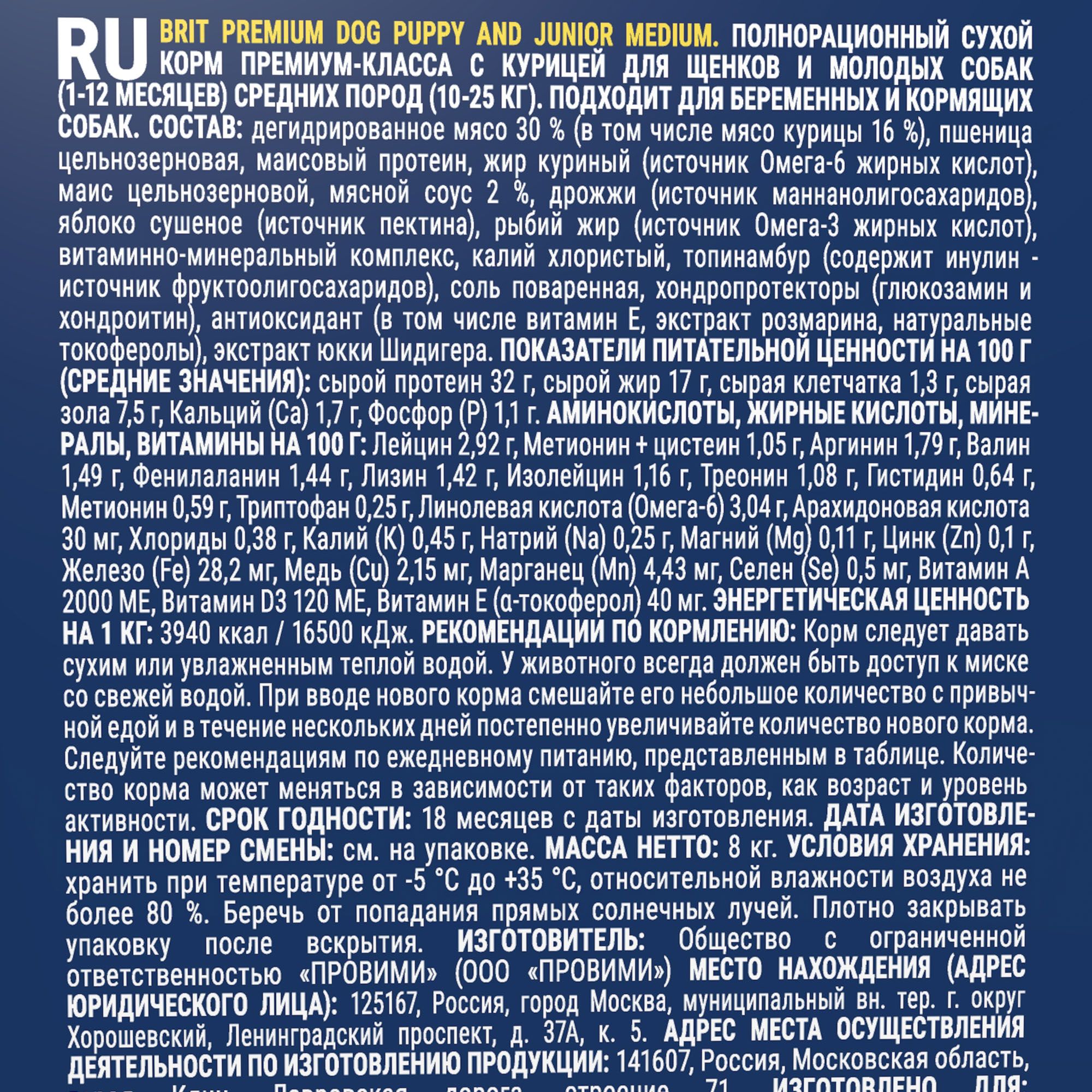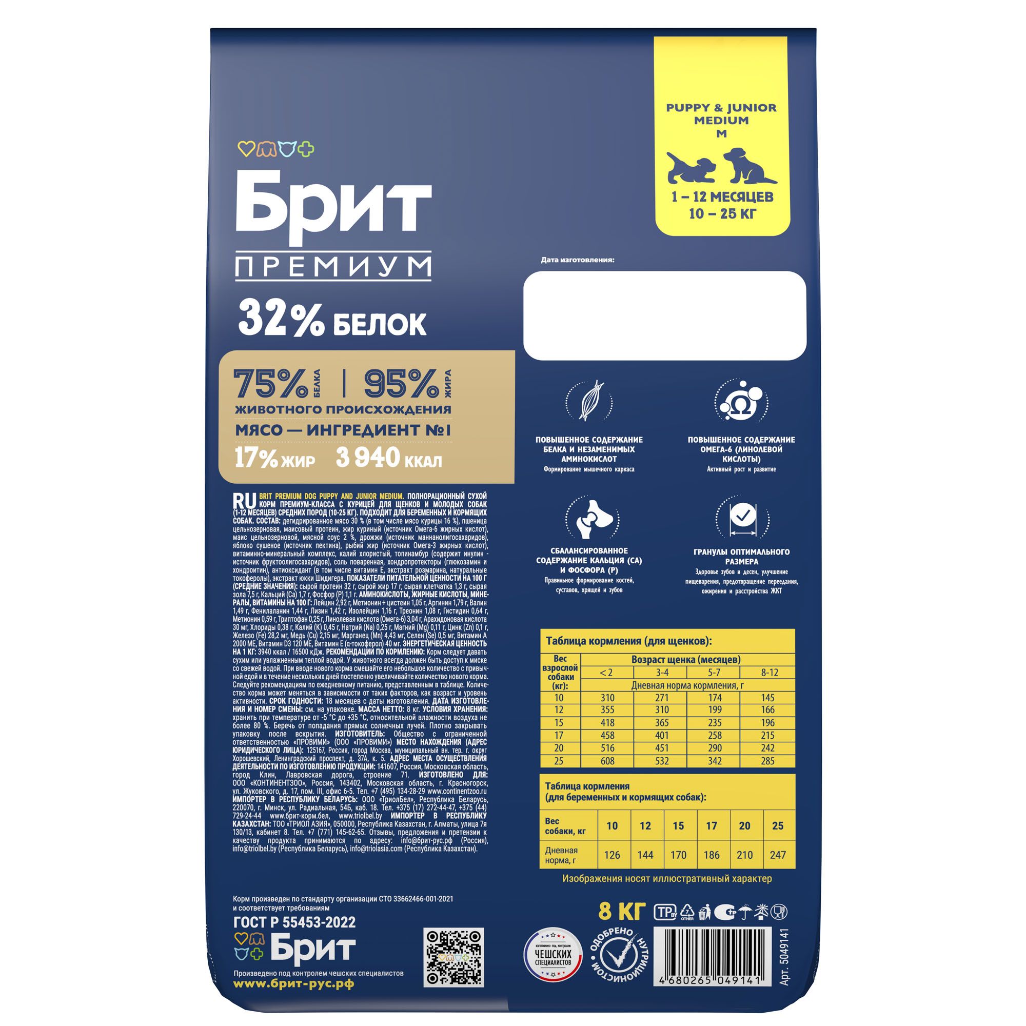 - BRIT PREMIUM, Сухой корм с курицей для щенков "Dog Puppy and Junior Medium", 8кг, 5049141