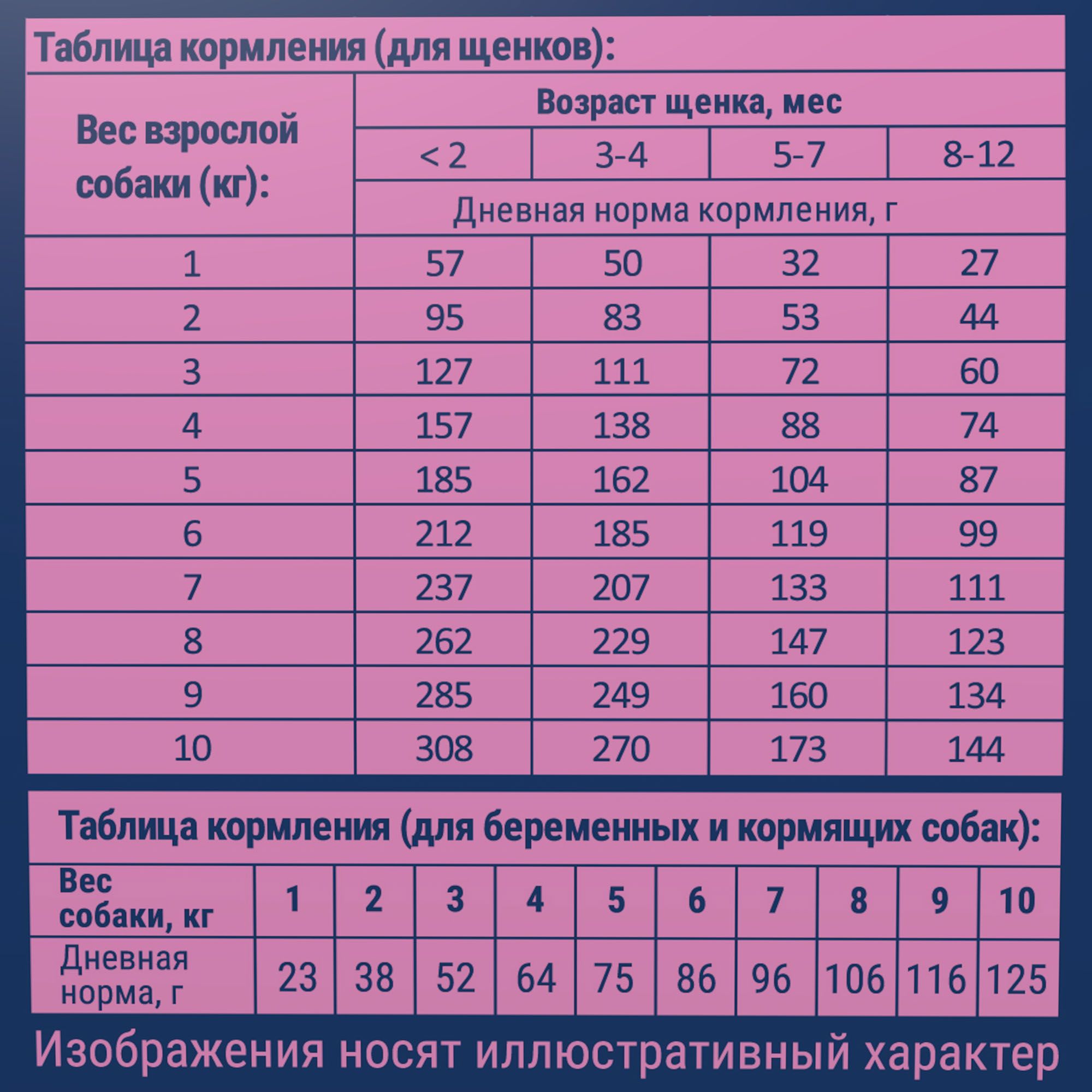 Рекомендуемая суточная норма кормления составляет 40-50 г на 1 кг веса животного, но учитывайте активность и аппетит вашей собаки. Переход с предыдущего корма следует осуществлять постепенно, небольшими порциями в течение 5-7 дней.