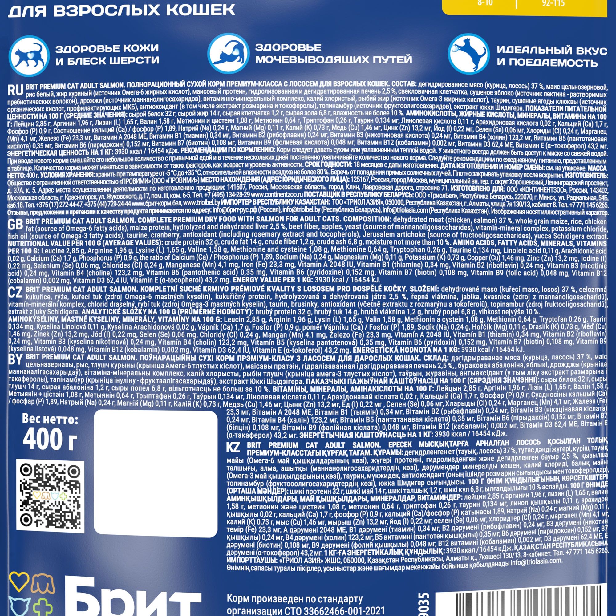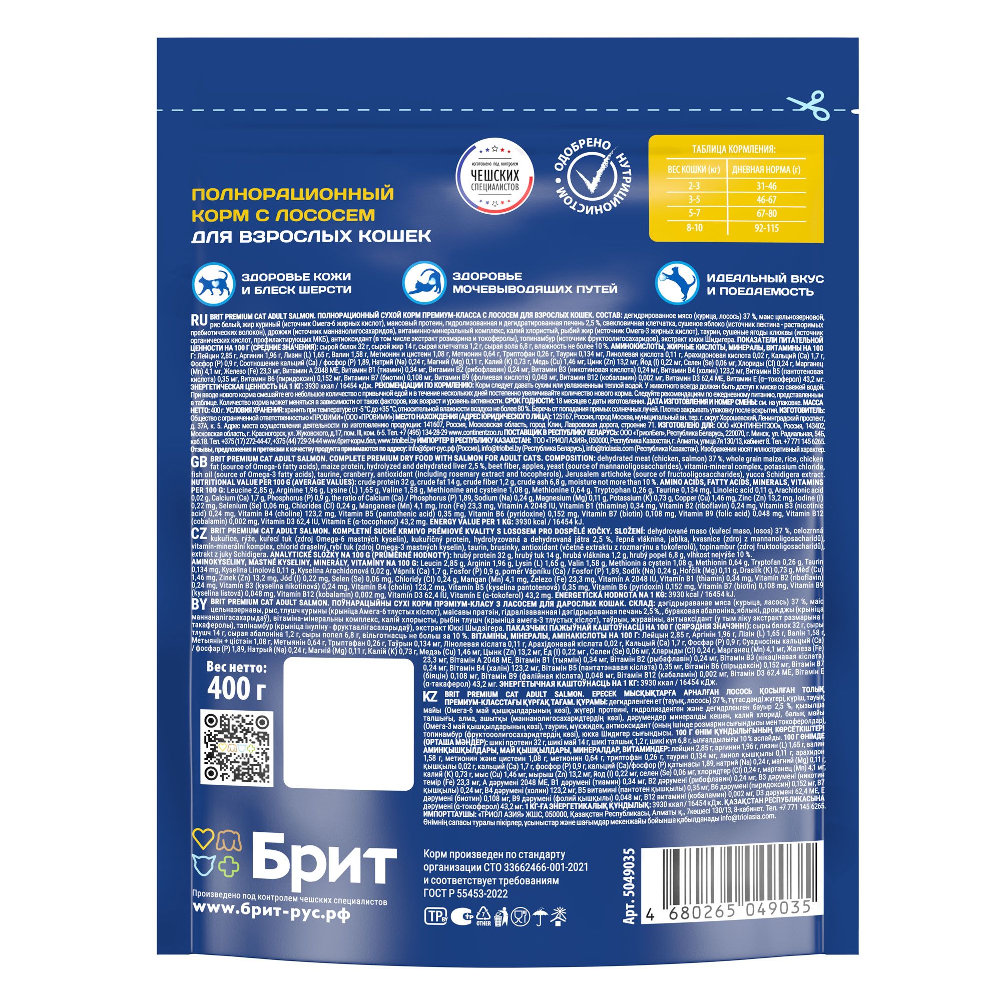 - BRIT PREMIUM, Сухой корм с лососем для взрослых кошек "Cat Adult Salmon", 0.4кг, 5049035
