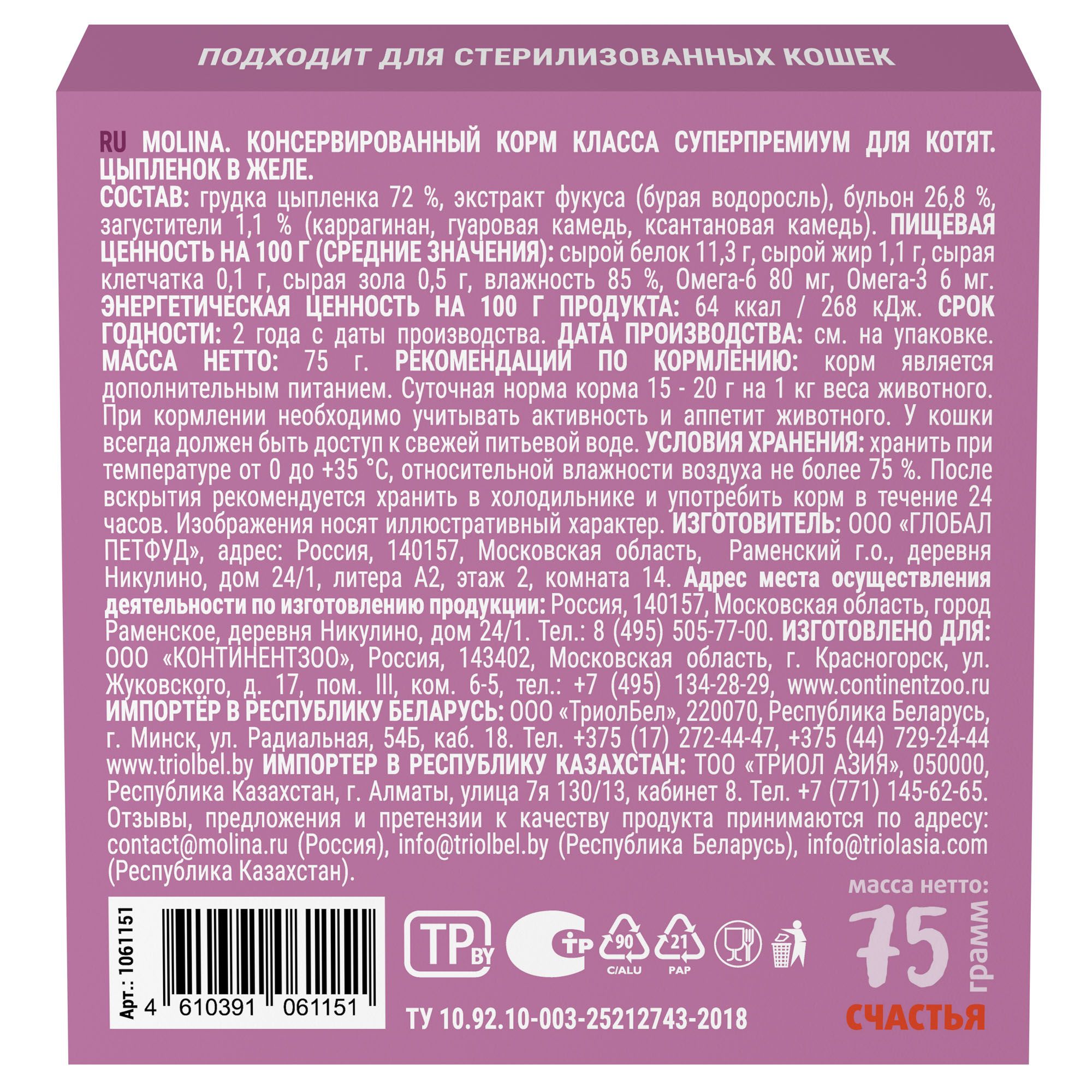 - MOLINA. Ламистер для котят. Цыпленок в желе, 75 г, 1061151