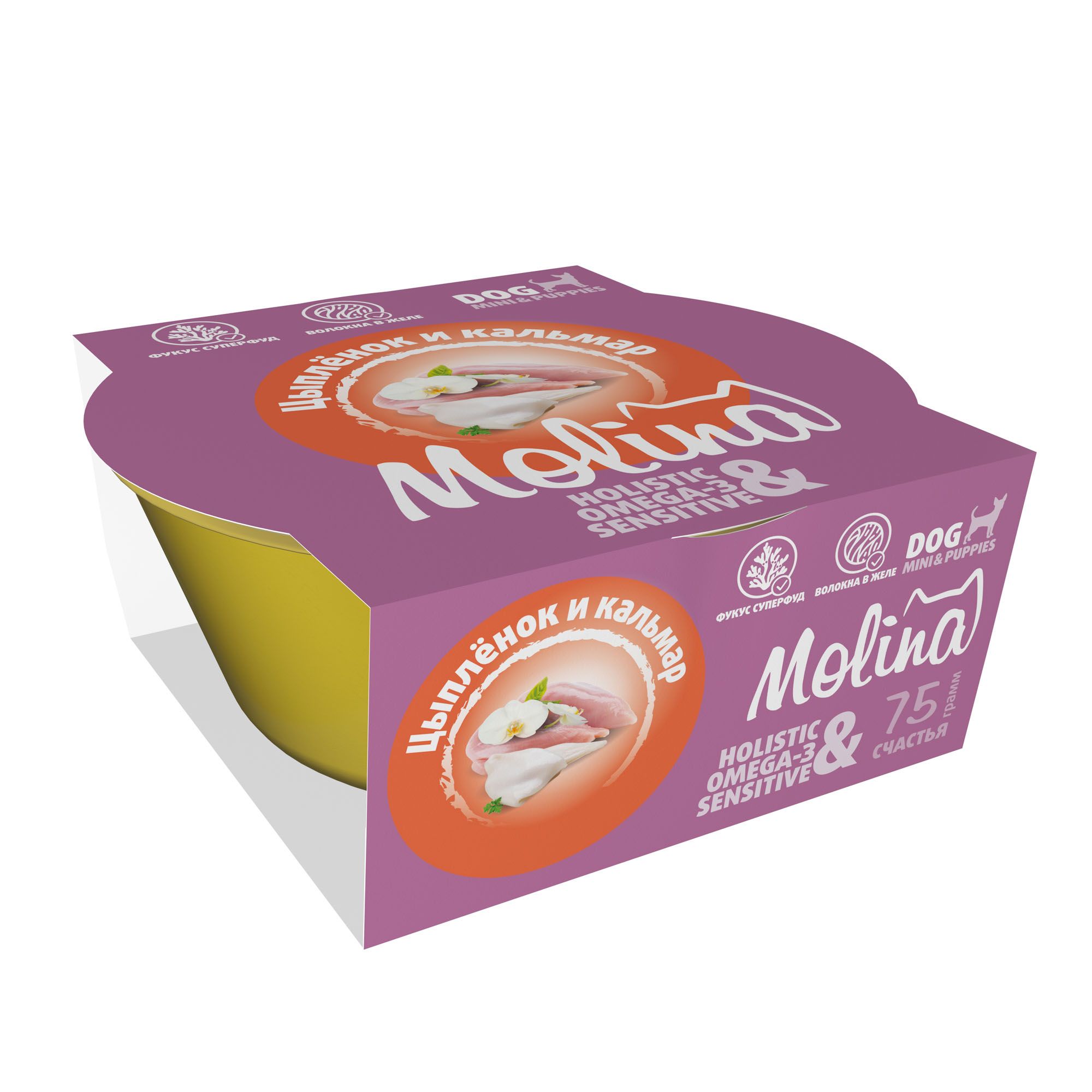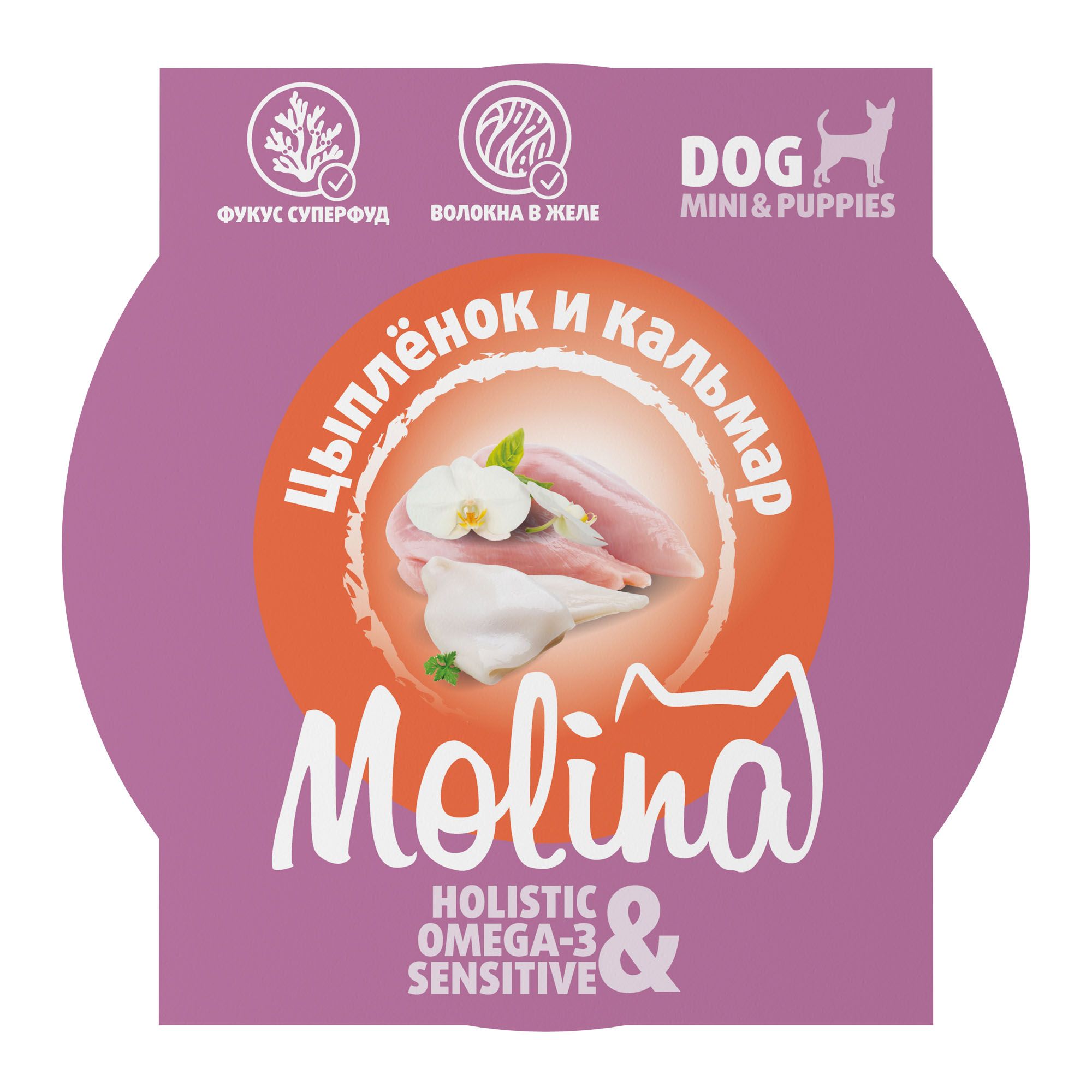 - MOLINA. Ламистер для взрослых собак мини-пород. Цыпленок и кальмар в желе, 75 г, 6010681