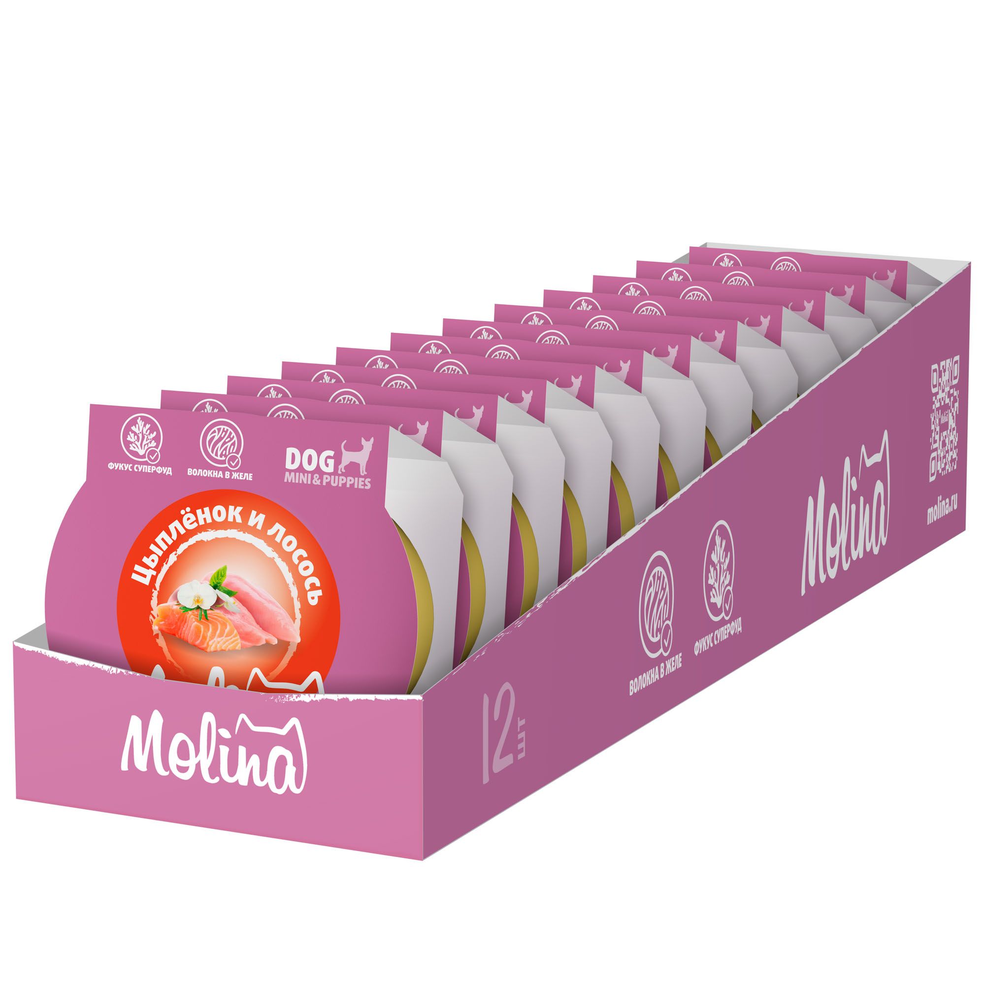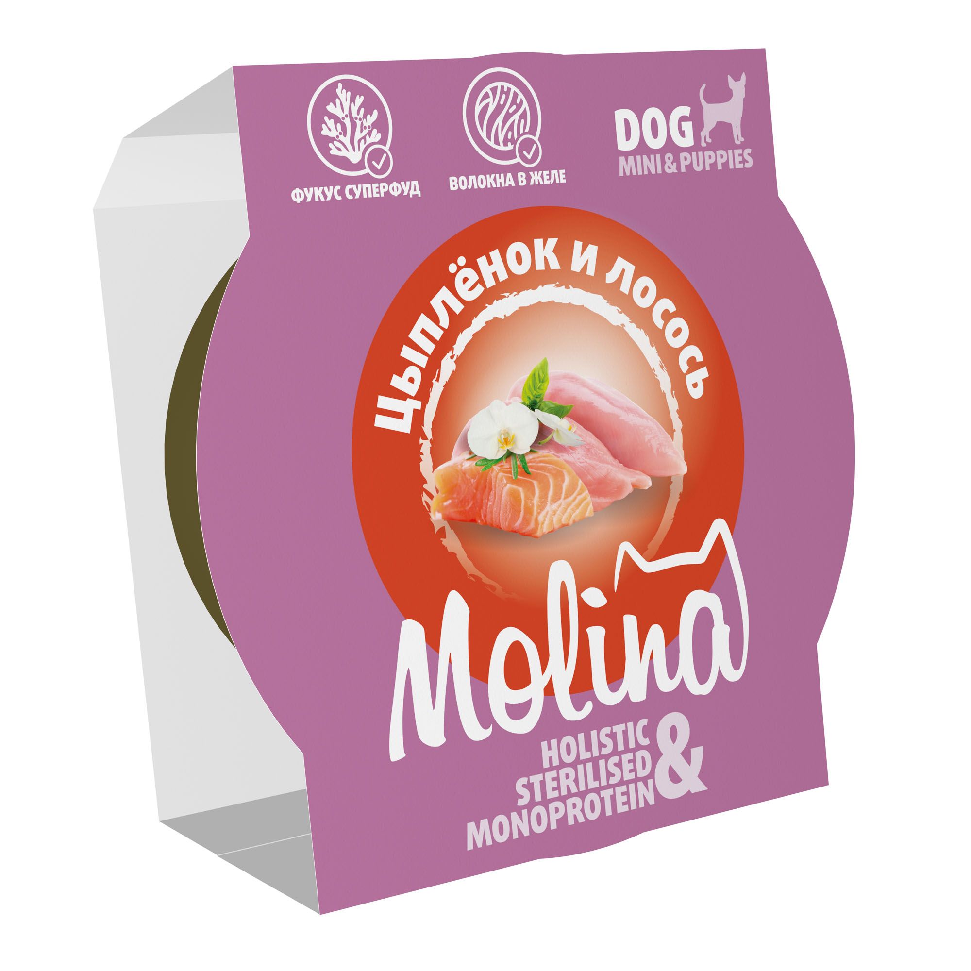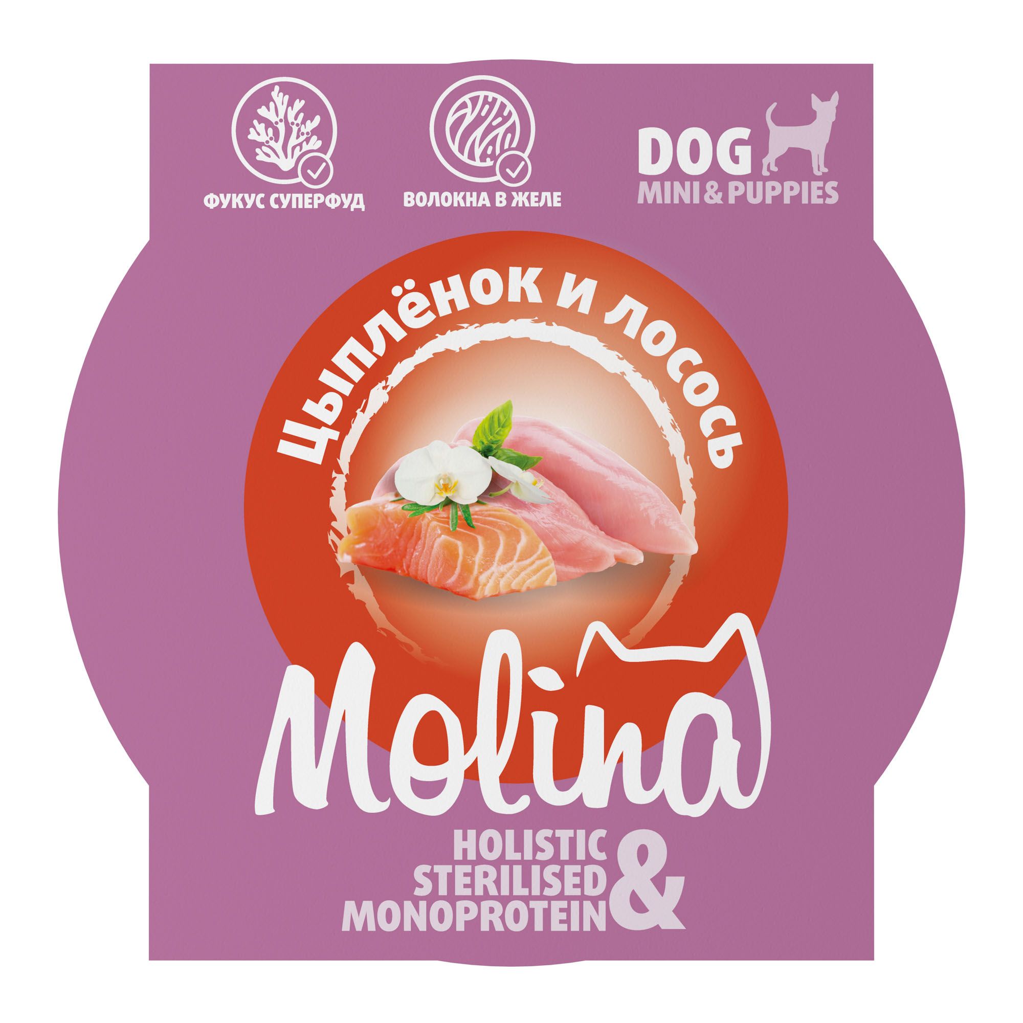 - MOLINA. Ламистер для взрослых собак мини-пород. Цыпленок и лосось в желе, 75 г, 6010698