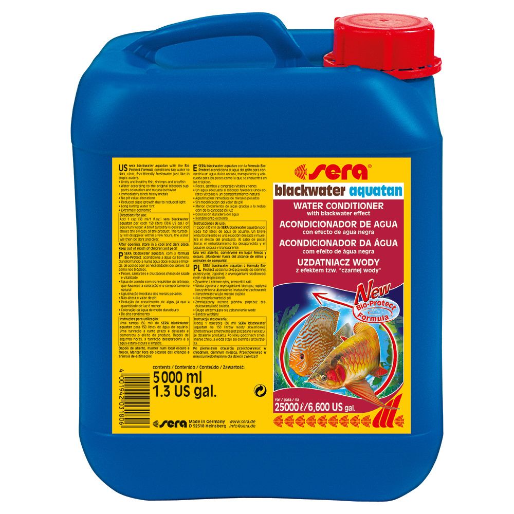 sera блэквотэ акуатан с Формулой Био Защиты (Bio Protect Formula) подготавливает водопроводную воду, которая становится темной, прозрачной и дружественной к рыбам пресной водой, как в тропических водах. Здоровые и полные жизни рыбы, креветки и раки. Вода, соответствующая биотопам, способствует богатству окраса и естественному поведению. Немедленно связывает тяжелые металлы. Не меняет pH-уровень. Уменьшает рост водорослей благодаря сокращению количества проникающего в воду света. Окрашивает воду на долгий срок. Очень экономичен. 5000 мл для 25000 литров