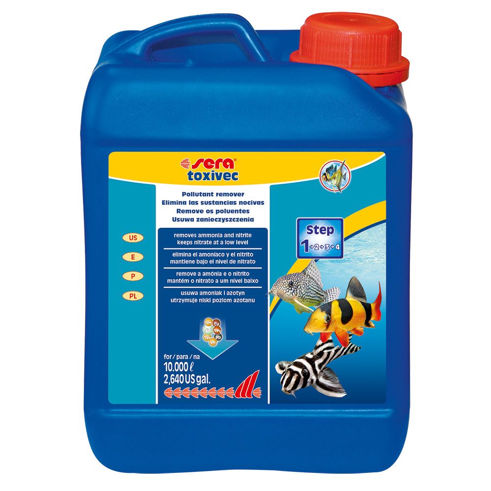 Дестабилизирующие факторы (кроме всего прочего перекармливание, перенаселенность, запуск новой рыбы в аквариум, серьезная чистка аквариума и оборудования или применение лекарственных средств) могут привести к резкому повышению содержания в аквариумной воде опасных вредных веществ, таких как аммиак и нитриты. В таких чрезвычайных ситуациях sera токсивек немедленно удаляет эти токсичные, а также другие опасные для рыб вещества, такие как, хлор и тяжелые металлы. После удаления вредных веществ естественное биологическое равновесие в аквариуме быстро восстанавливается, без излишней необходимости в повторных, порождающих стресс, подменах большого объема воды. Немедленно удаляет токсичные для рыб аммиак и нитриты. Связывает вредные тяжелые металлы, такие, как свинец и медь. Удаляет хлор и хлорамины. Уменьшает образование нитратов и, таким образом, ограничивает рост водорослей. 2500 мл для 10000 литров